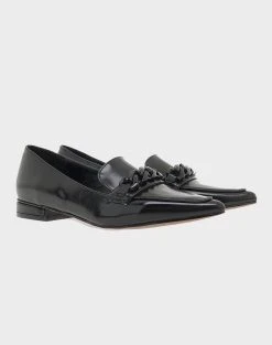 Γυναικεία μοκασίνια μονόχρωμα λουστρίνι, από τη συλλογή της εταιρείας EXE. Με διακοσμητική αλυσίδα χρώματος ασημί μπροστά. (Σύνθεση: Οικολογικό δέρμα)