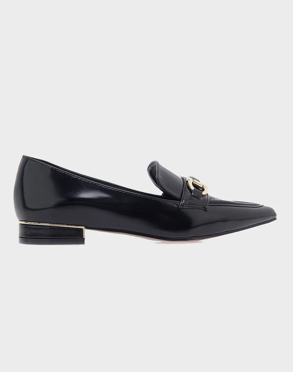 Γυναικεία μοκασίνια μονόχρωμα λουστρίνι, από τη συλλογή της εταιρείας EXE. Με διακοσμητική αλυσίδα χρώματος χρυσό μπροστά. (Σύνθεση: Οικολογικό δέρμα)