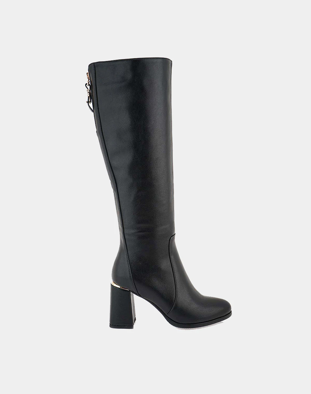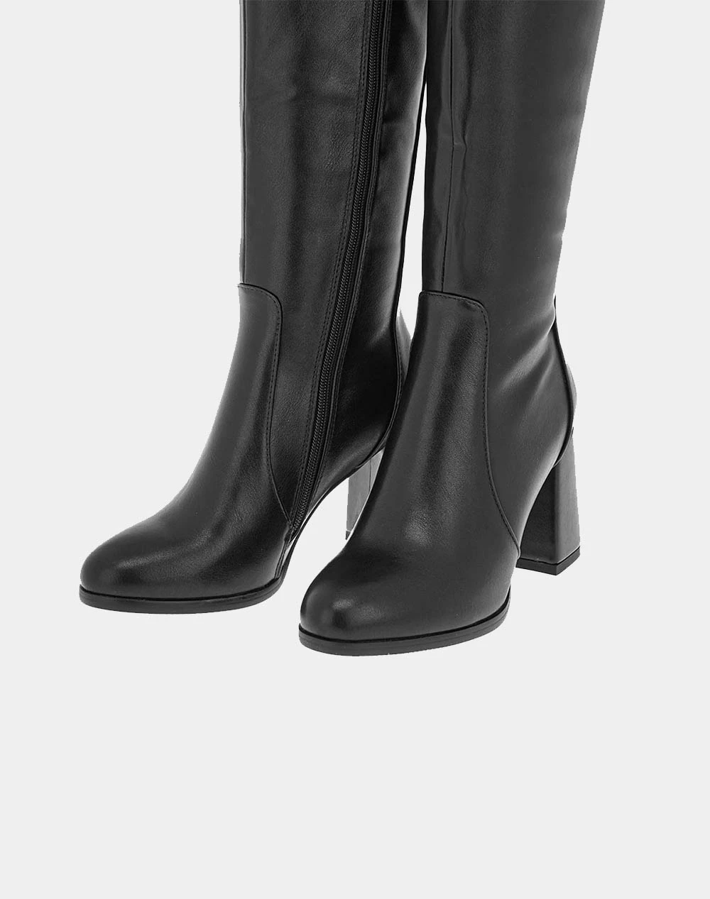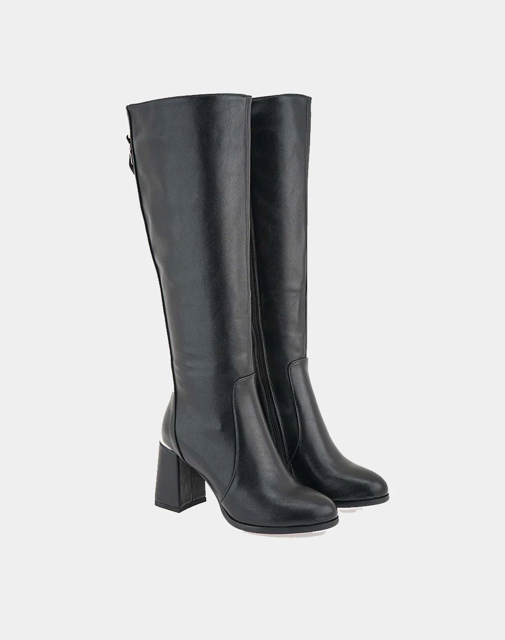 Μπότες μονόχρωμες από τη συλλογή της εταιρείας EXE, με διακοσμητική λεπτομέρεια στο τακούνι και κλείνει με φερμουάρ στο πλάϊ αλλά και στο πίσω μέρος. (Σύνθεση: Οικολογικό δέρμα)