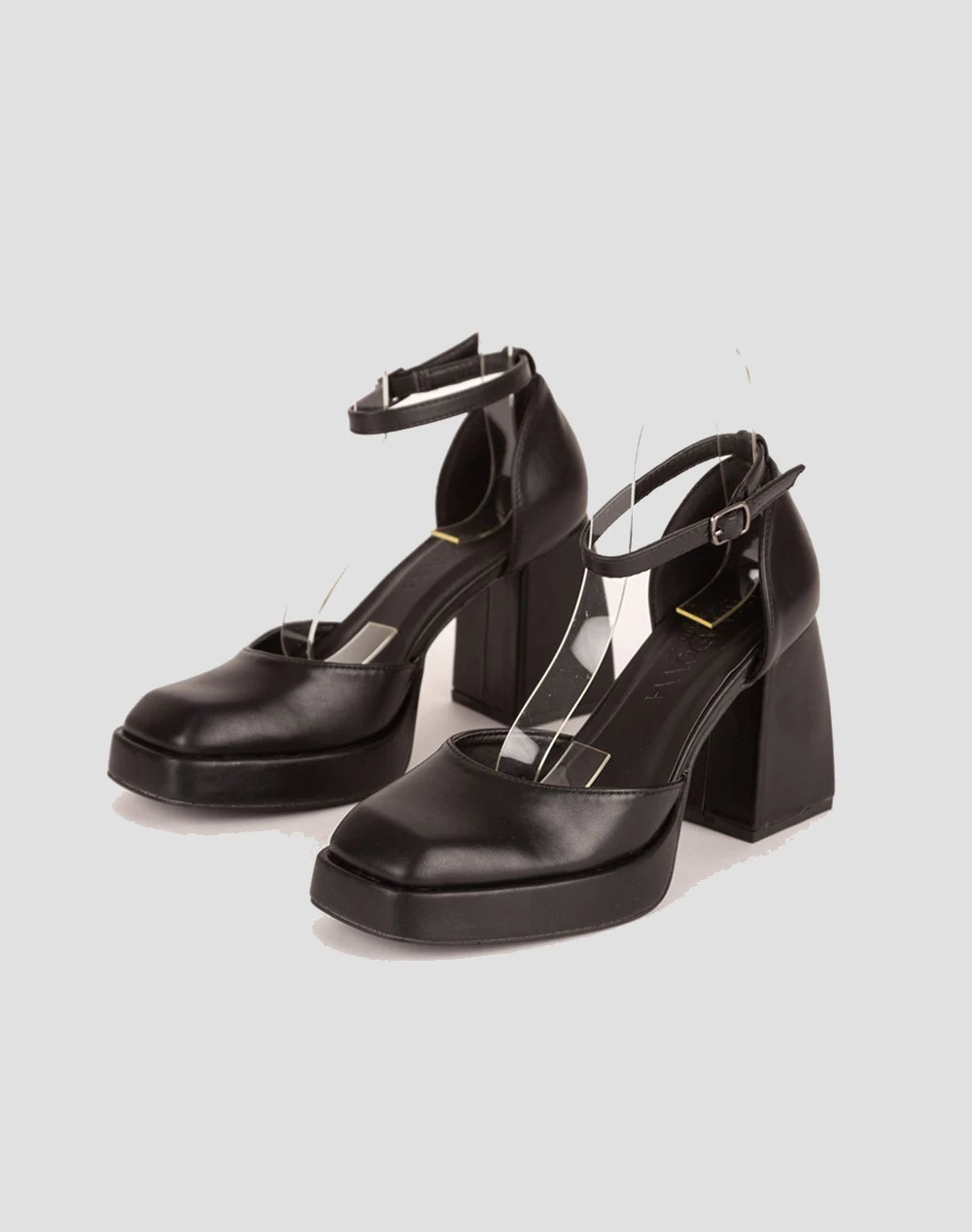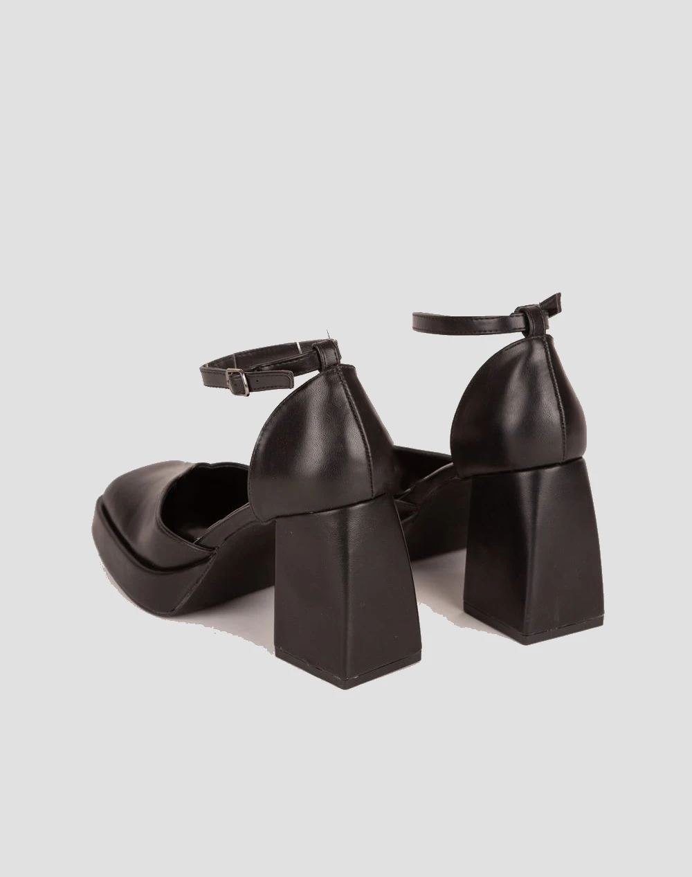 Γυναικείες γόβες μονόχρωμες ματ, με τετράγωνη μύτη και χονδρό σταθερό τακούνι με ύψος 9 εκ και ρυθμιζόμενο λουράκι στον αστράγαλο. (Σύνθεση: Οικολογικό δέρμα)